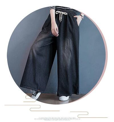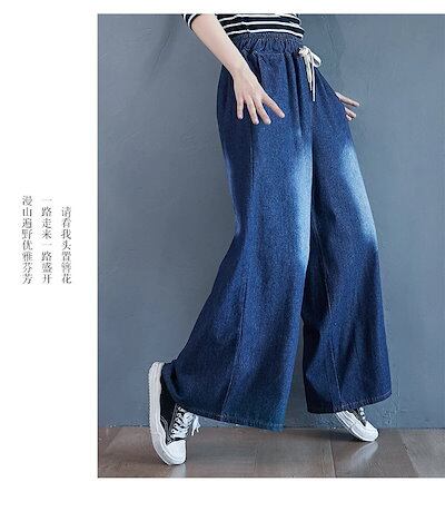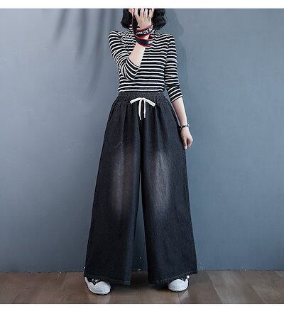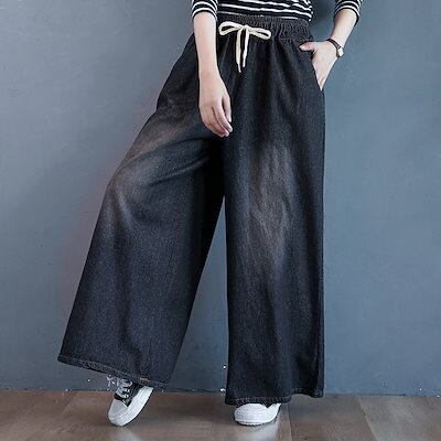 「ファットガール」 秋冬 デニムパンツ ゴム ワイドパンツ ハイウエスト 大きいサイズ ゆったり フレア レディース ロングパンツ