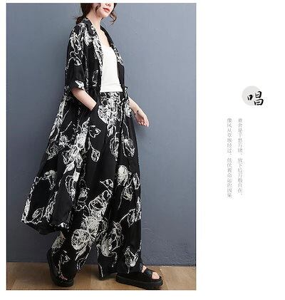 「ファットガール」花柄セットアップ 上下セット レディース スーツセット ロングブラウス+ワイドパンツ ゆったり 体型カバー お尻すぽっり ママスーツ 中年 30代/40代 メガ割