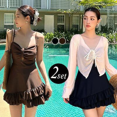 水着 ワンピース 体型カバー シースルー トップス 2点セット レディース オールインワン 大きいサイズ キャミワンピ クロップド丈 ボレロ 長袖 胸元 ギャザー ティアード フリル ノンワイヤー 二