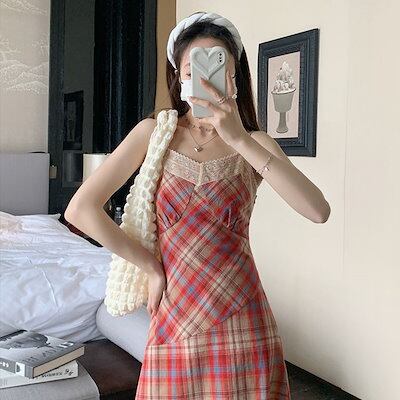 ワンピース しいレトロなチェック柄キャミワンピースのフレンチスウィート純欲レースのパッチワークロングa字スカート代 30代 大きいサイズ 韓国 韓国ファッション 水着 ビーチツアー ワンピース