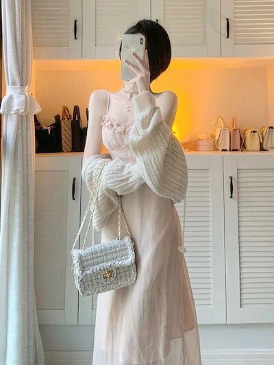 ワンピース 2枚セットフレンチミニ初恋スカートキャミソールワンピース+ニットカーディガン代 30代 大きいサイズ 韓国 韓国ファッション 水着 ビーチツアー ワンピース ベーシックニット カー