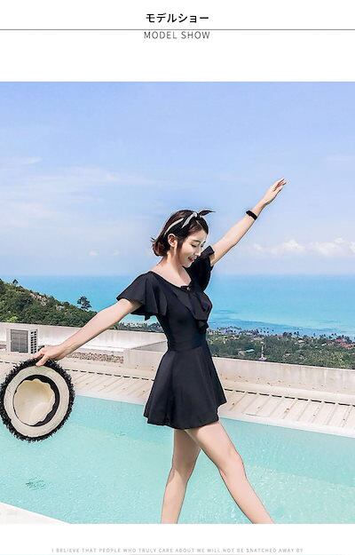 水着 オールインワン ワンピース レディース ブラック フリル 大きいサイズ 小胸 体型カバー フレアスカート 黒 露出控えめ 保守水着 温泉水着 体重40kg-70kg