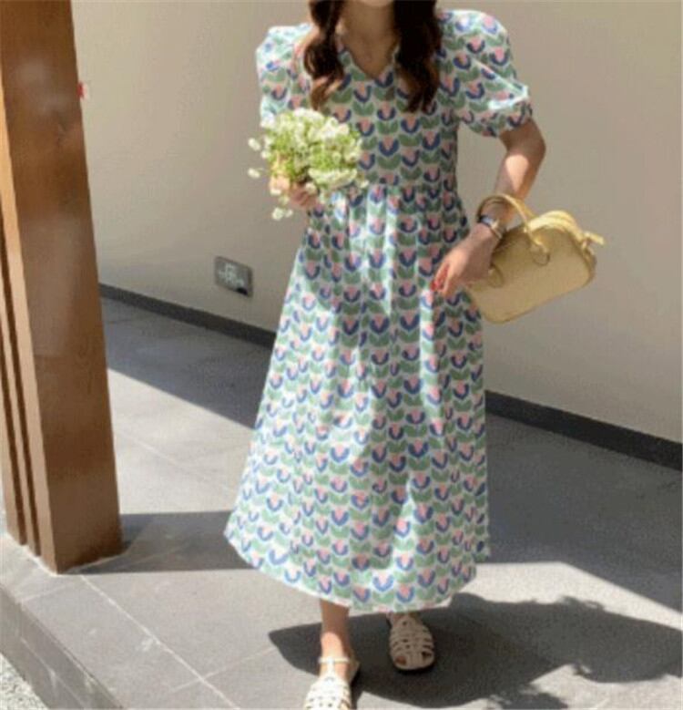 韓国 気質 フローラル Vネック 中・長セクション 半袖 ゆったりする ワンピース エレガント 百掛けTREWPL36975126