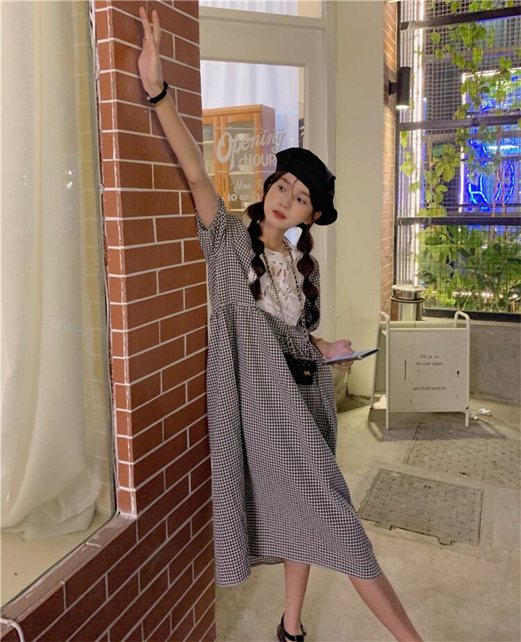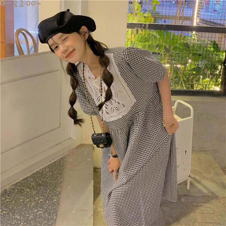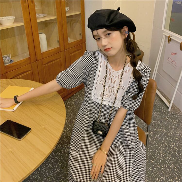 活気に満ちた少女 おしゃれ シンプル レトロ チェック柄 縫付 半袖 レース ゆったりする ワンピースTREWPL36975130