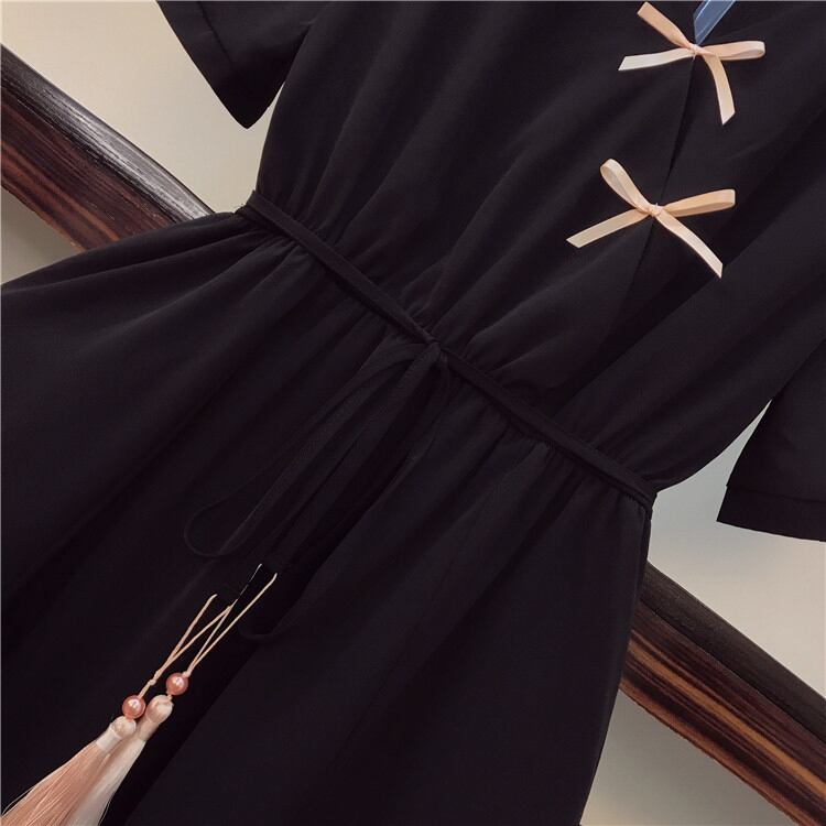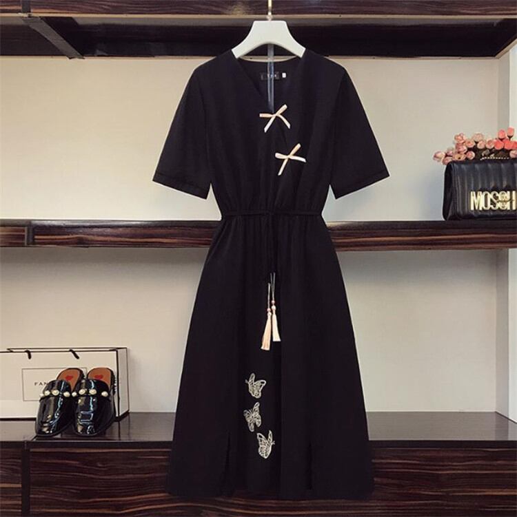 通勤する 大きいサイズ 中・長セクション百掛け カバー腹 Vネック 半袖 ワンピース