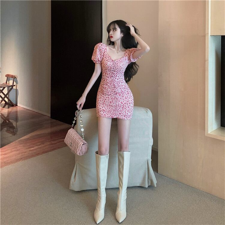 sweet系 花柄 ワンピース 気質 スリムフィット 百掛け 2021年春 半袖 スクエアネック 背透けて セクシー