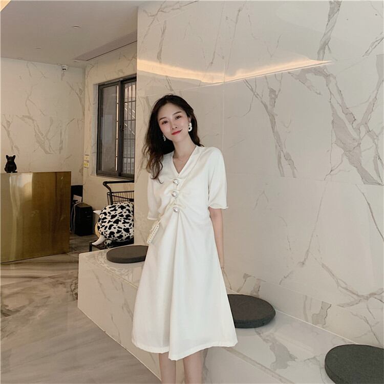 すごく可愛いです フレンチスタイル トレンド Vネック 真珠 シワ スリム ワンピース 半袖 シンプルVGFTIOK2378106