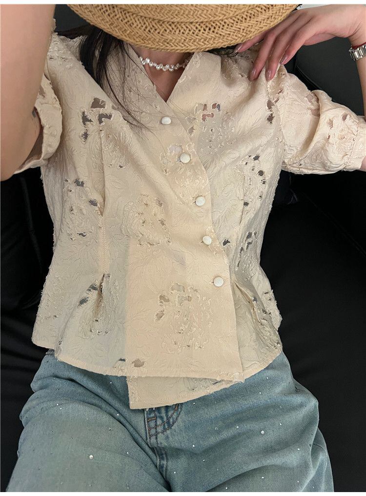 刺繍パフスリーブシャツ女性の半袖2024新しいシャツウエストスリムVネックトップトレンドMJUY123101
