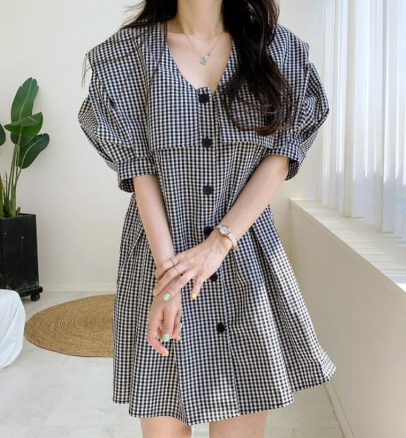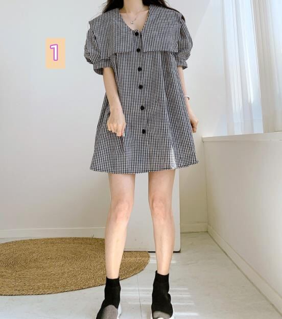 春夏新作 女 レディース ハイウエスト 半袖 チェック柄 ミニ ワンピース ドレス 台型スカートJHBYU5875107