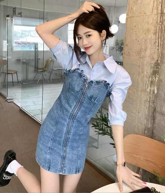春夏新作 女 レディース ハイウエスト半袖 デニム ミニ ワンピース ドレス タイトスカート M/LTYRO452113
