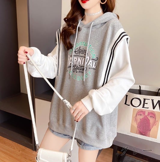 全3色 スウェット トレーナー 裏起毛 フェイク 切り替え 体型カバー 着痩せ 帽子付き 【大きいサイズあり】★# QWMKIG36952