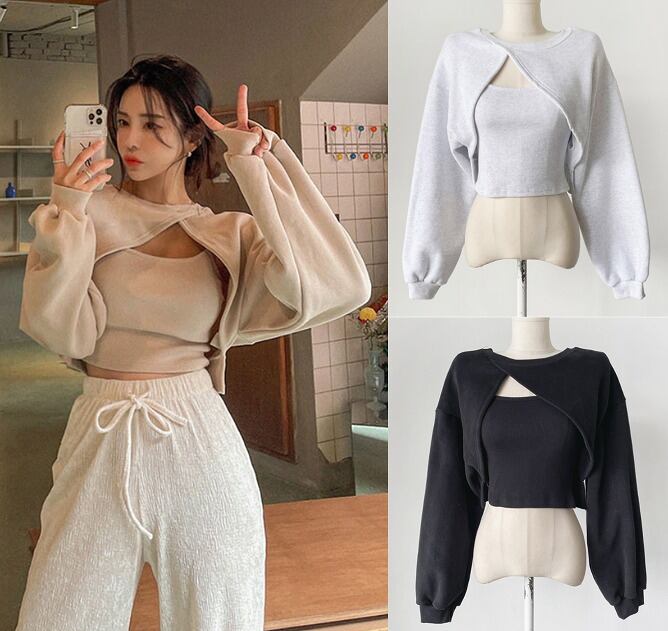 全3色 スウェット トレーナー 2点セット アシンメトリー 切り替え 体型カバー 着痩せ カジュアル★# IKUY6259