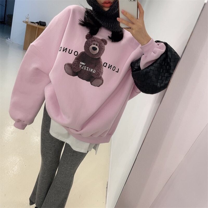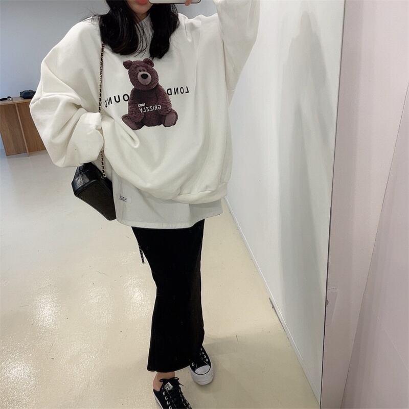 秋冬新作 レトロ ゆったり 長袖 プリント くまちゃん アルファベット プルオーバー トレーナー★# JJKIEB77