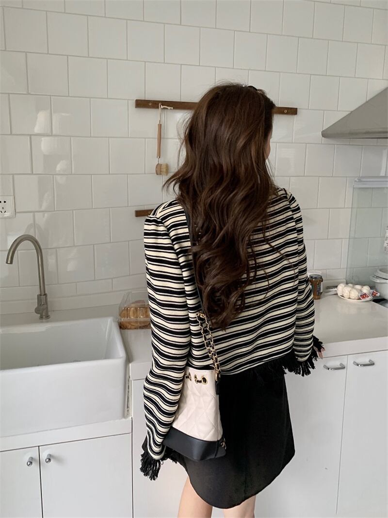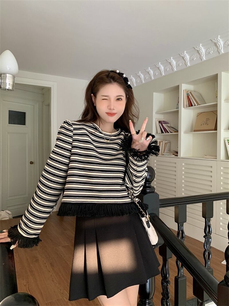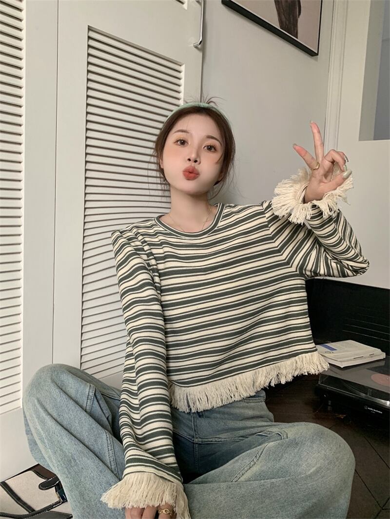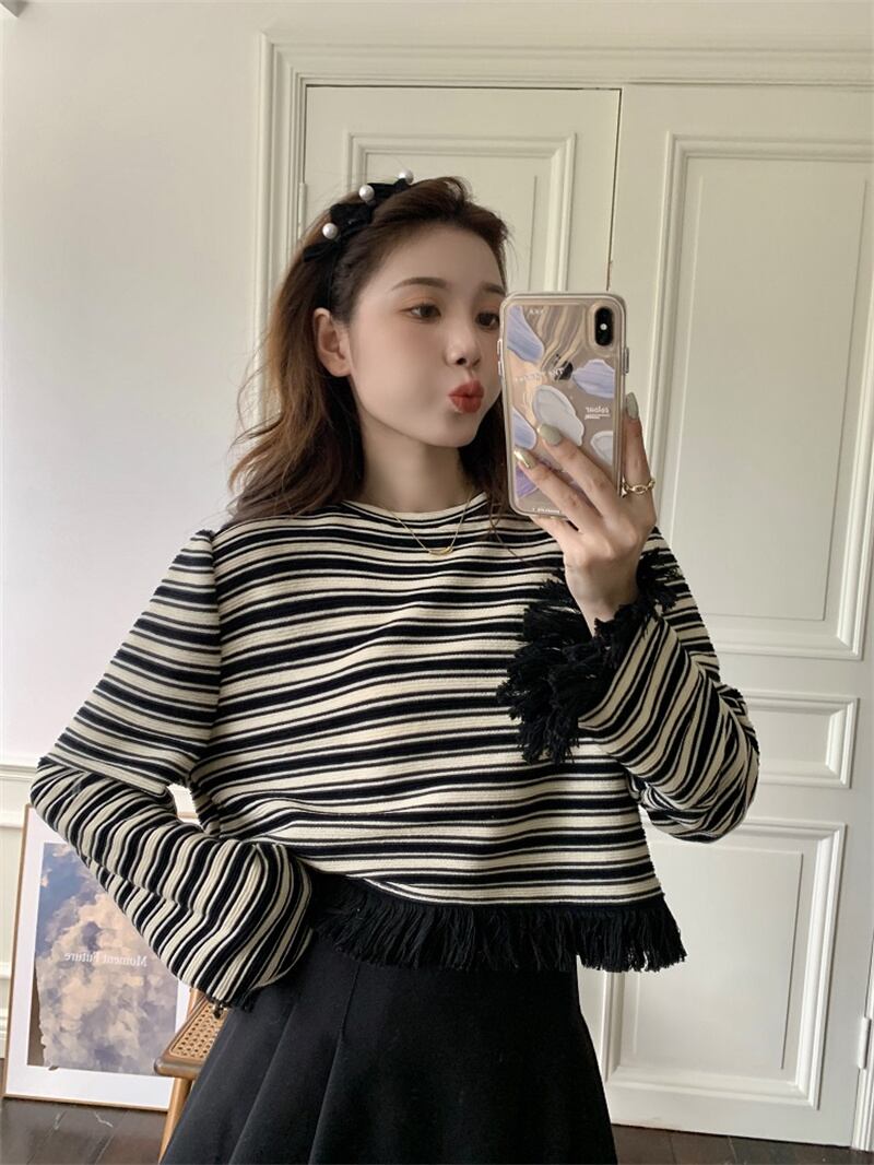 秋冬 新作 カジュアル レトロ ストライプ柄 タッセル プルオーバー トレーナー★# GFEW863255