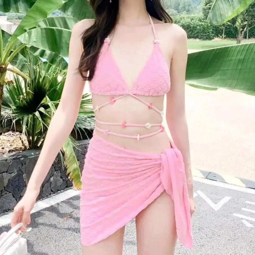 女性用単色ビキニセット、ホルターブラ、レースアップひも、カバーアップ、スカート、セクシーなベビーベッドクロス、女性用水着、3個セット ビキニ Tシャツ T240619000022_02