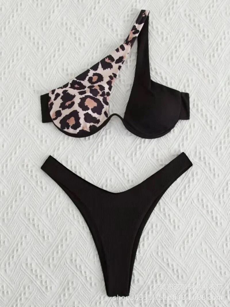 女性用ツーピースヒョウ柄水着,ワンショルダービキニセット,水着 ビキニ Tシャツ T240619000207_03