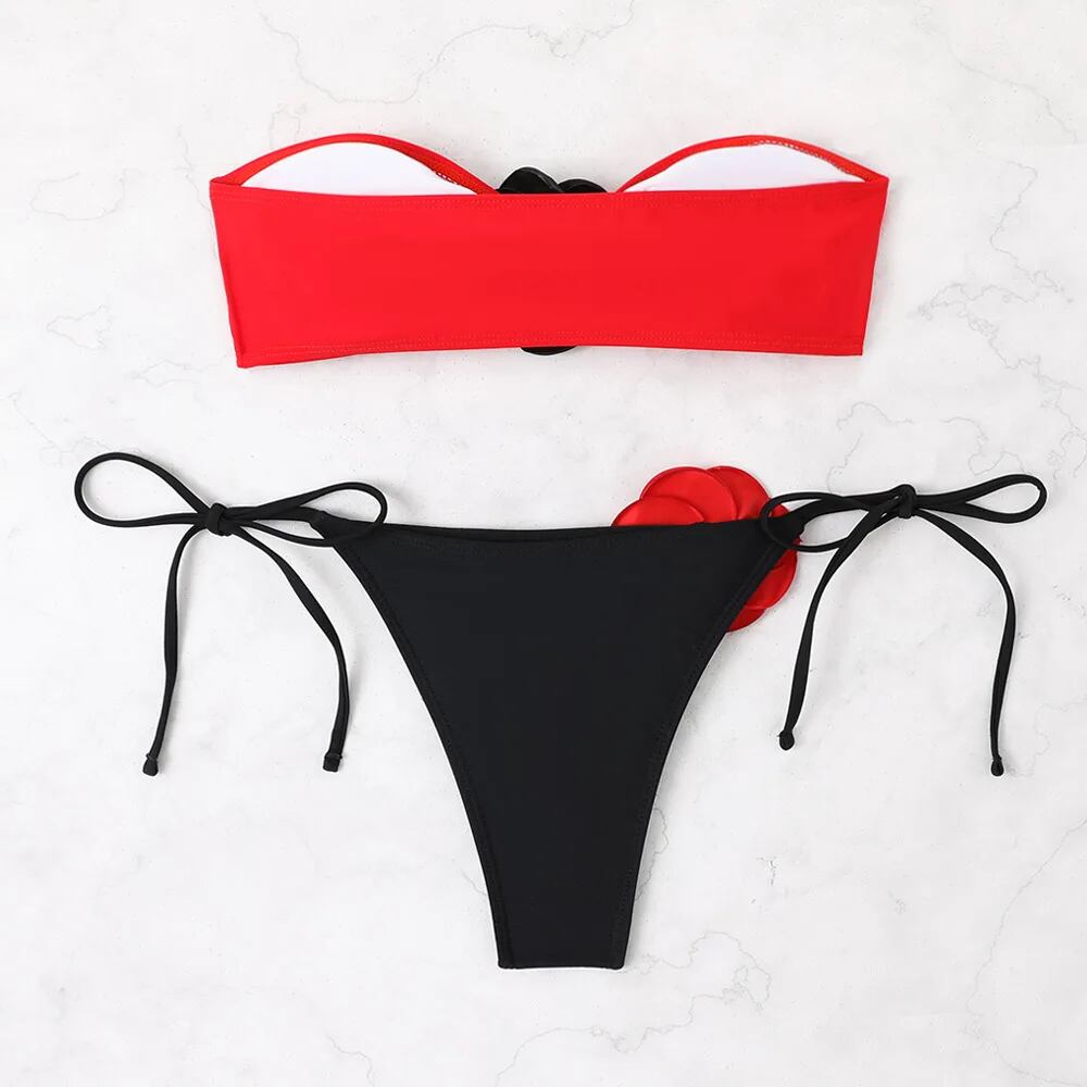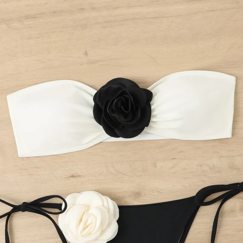 女性のためのセクシーなビキニセット,ツーピースの水着,バンドゥ,3D花,白,黒,コントラスト,プッシュアップ,マイクロ水着,ブラジル,カットアウト,ひも付き水着,2021 ビキニ Tシャツ T240619004042_02