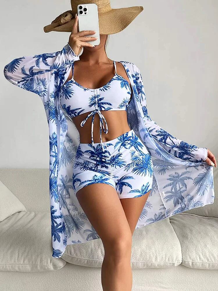 女性のためのトロピカルロバープリントビキニ、ギャザーカバーアップ水着、長袖水着、ビーチウェア、スーツ、ひも、3パック、2024 ビキニ Tシャツ T240619004110_10