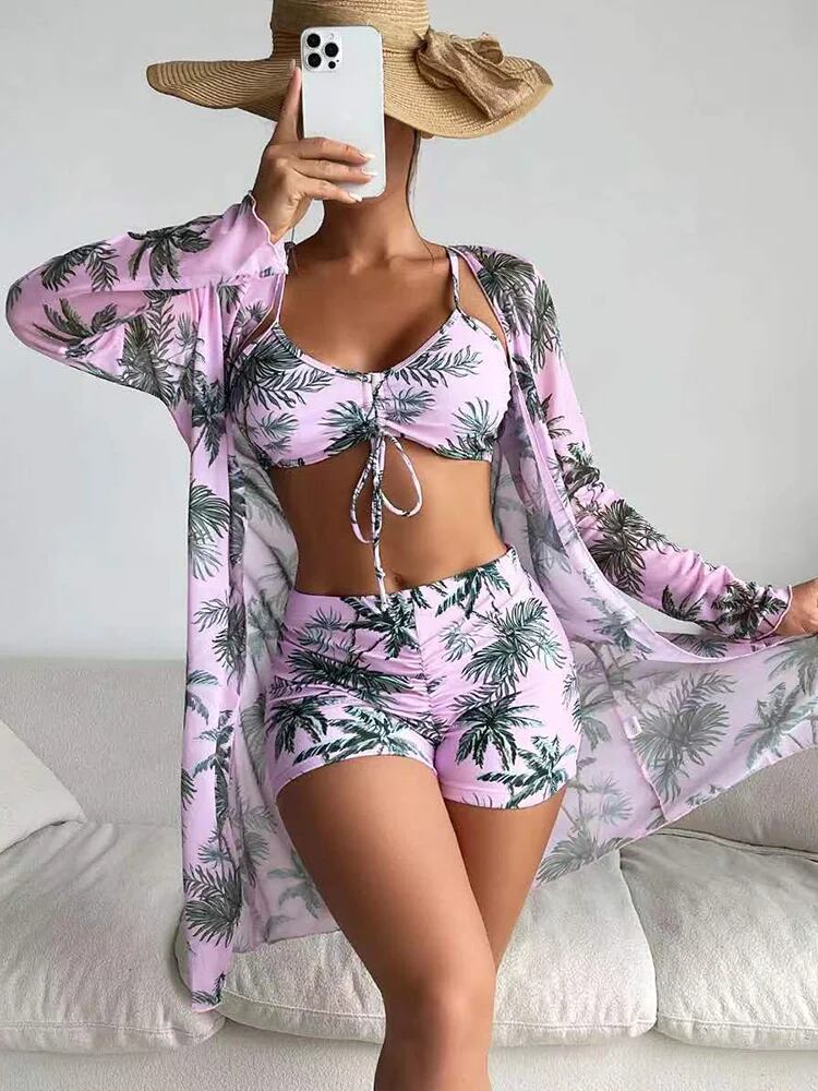 女性のためのトロピカルロバープリントビキニ、ギャザーカバーアップ水着、長袖水着、ビーチウェア、スーツ、ひも、3パック、2024 ビキニ Tシャツ T240619004110_13