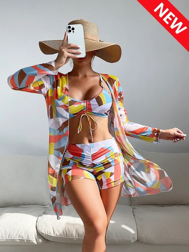 女性のためのトロピカルロバープリントビキニ、ギャザーカバーアップ水着、長袖水着、ビーチウェア、スーツ、ひも、3パック、2024 ビキニ Tシャツ T240619004110_17