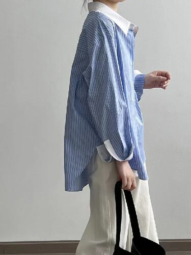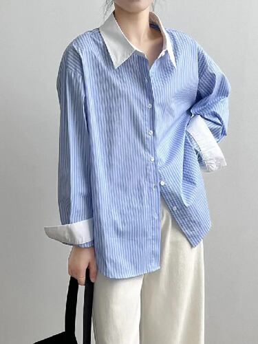 女性用ストライプパッチワークシャツ、ルーズラペル、女性用長袖ブラウス、韓国シック、エレガントなオールマッチボタントップス、夏