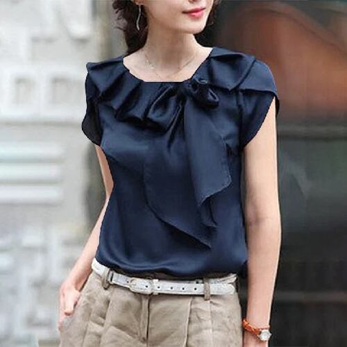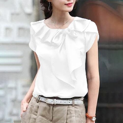 Zanzea-レディースシック半袖ブラウス、エレガントな蝶ネクタイのステッチシャツ、単色、オフィス、ラウンドネック、チュニック、カジュアルなルーズフィットトップス
