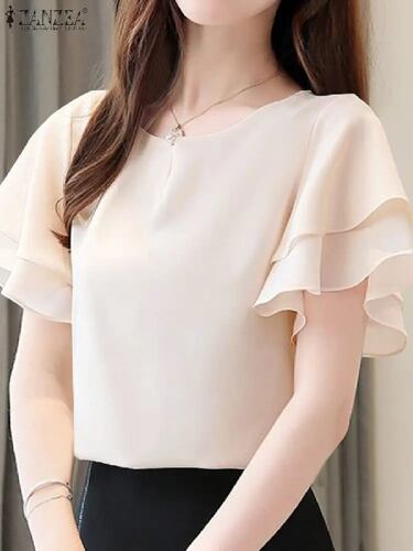 Zanzea-女性用半袖オフィスシャツ、ラウンドネックブラウス、トンビックフリル、エレガントなトップス、olワークファッション、ソリッド、夏
