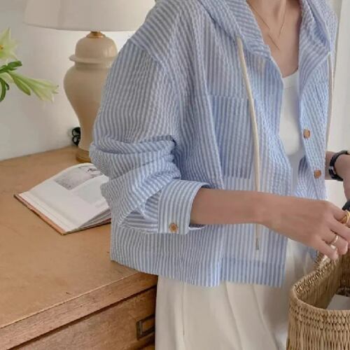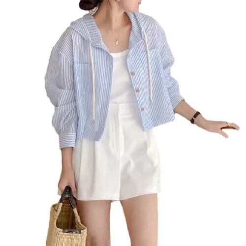 女性の日焼け止めフード付きシャツ、ストライプのルーズカーディガン、女性のための用途の広いトップ、夏の通気性のある薄い丈夫なシャツ