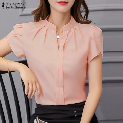 Zanzea-Vネックシフォンブラウス,女性用,半袖トップス,プリーツシャツ,エレガント,フォーマルオフィス,夏,2022