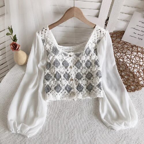 女性用シフォンスリーブ付きかぎ針編みブラウス,フロントボタン付きカーディガン,幾何学的刺繍,春と夏のデザイン