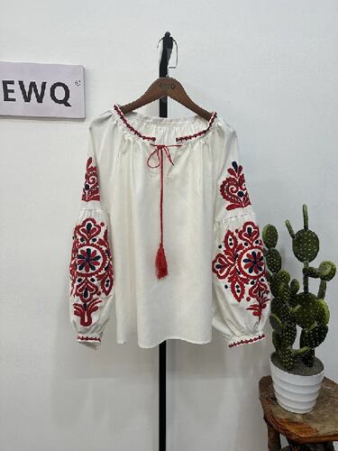 女性のためのewq-甘いスタイルのプルオーバーシャツ、刺embroideryパッチワーク、包帯Vネック、ランタンスリーブ、春、夏、新しいブラウス、sn0452、2023