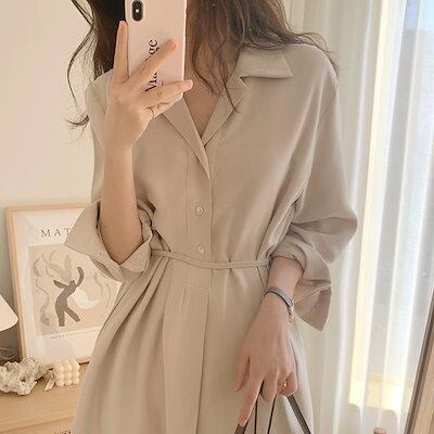 長袖 2024新作 ラペル シングルブレスト ヘムライン スプリット シャツドレス