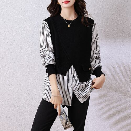 初回送料無料 新作レディースファッション カジュアル フェイク2枚 パッチワーク 長袖トップス
