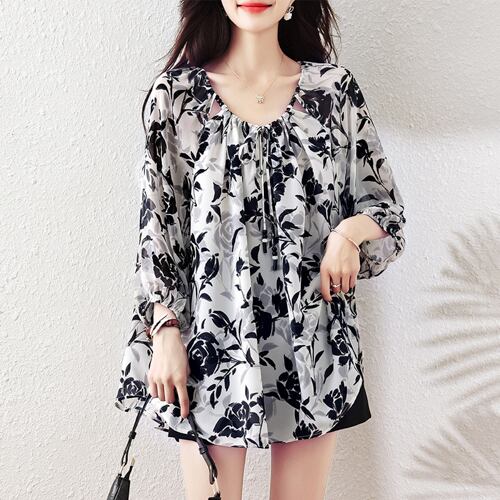 初回送料無料 新作レディースファッション オシャレ ゆったり シフォン 花柄 長袖トップス