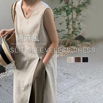 ワンピース 夏の新作 開叉 綿麻 ワンピース ノースリーブシンプルvタンクトップ 着痩せ 膝丈スカート レディース 韓国ファッション