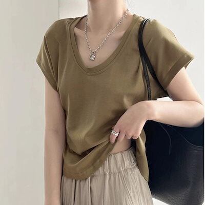 Tシャツ トップス Uネック 鎖骨 小飛袖 トップス 夏シンプルフレンチ薄手 半袖 レディース 韓国