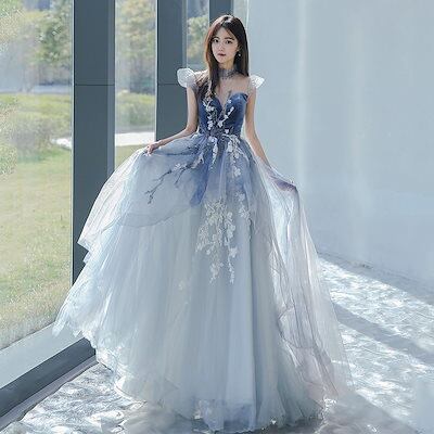 2024新品追加パーティドレス ブルー ワンピース 韓国ファッション ロングドレス 結婚式 誕生日 演奏会 花嫁 司会
