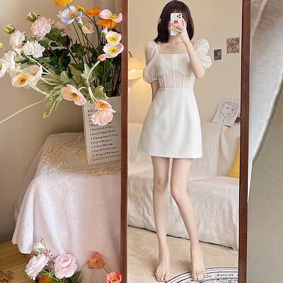 新入荷続々 ホワイトワンピースフレンチ スクエアネックセレブパーティドレス夏