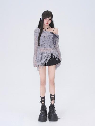 2024新入荷 スーツ集合 韓国ファッション 春夏 グレーのリボンセーター 長袖 ゆったり Tシャツファッションクール ニット フリンジトップスブラウス