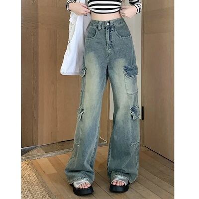 ワイドパンツ レトロ ワークウェア ジーンズ レディース 秋 ルーズ ハイウエスト 薄手 ストレート ズボン 美脚 韓国