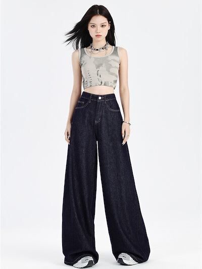 ワイドパンツ アメリカンスタイル ネイビーブルー ジーンズ レディース 夏の秋 薄手 ハイウエスト ゆったり ストレート 薄手 モップ本 美脚 韓国