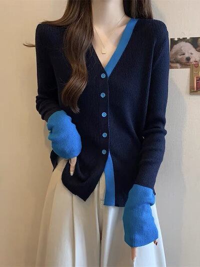 【3日以内出荷】カーディガン フェイクツーピース 色の衝突 Vネック ニット 秋 薄手 スリム ジャケット パッチワーク 長袖 トップス レディース 韓国