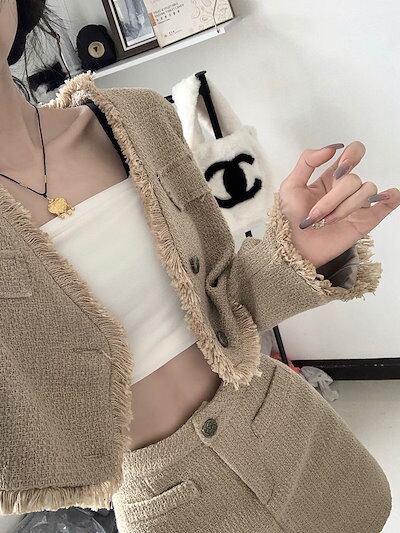 涼しく楽ちんセットアップ 二点セット 秋の新作 デザイン タッセル Vネック ショート ジャケット+ ハイウエスト スカート 韓国