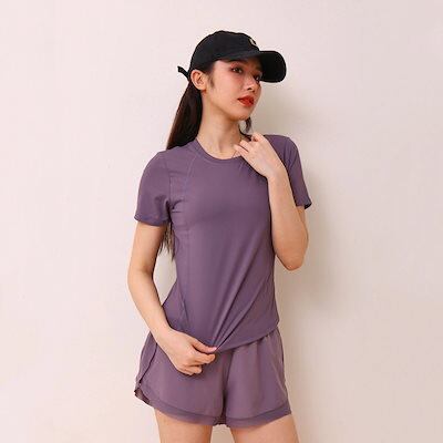 3日以内に発送 速乾性メッシュスプライシング露出防止スポーツレディース夏ゆったりランニングルーズハイウエストヨガウェア半袖スーツ おしゃれヨガウェアセット