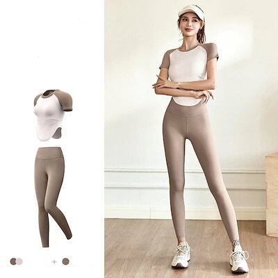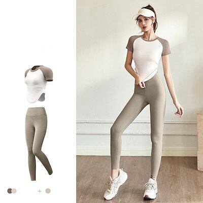 おしゃれヨガウェア レディース セットアップ カップ付お家ヨガウェア高弾性半袖スキニー胸シャーリングウエストバンド衝突色スポーツフィットネスウェア