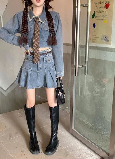 デニム ジャケット プリーツスカート セットアップ ベルト ネクタイ アウター シャツ ショート 加工 ミニスカート 加工 フレイドヘム 上下セット カジュアル ガーリー
