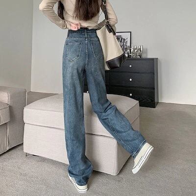 脚長効果!ワイドパンツ 2024 春夏 新作 ネイビーブルー ジーンズ ワイドパンツ春デニム 着痩せ ストレート レトロカーゴパンツ一本で韓国ストリートコーデ完成