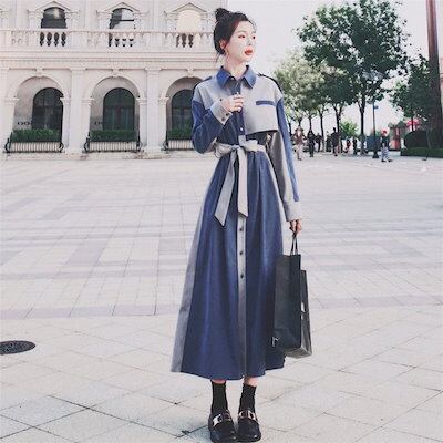 ロングワンピース 秋 Aライン シャツワンピース ワンピース ベロア レディース パッチワーク