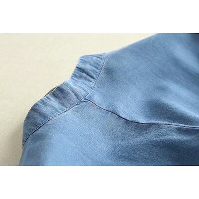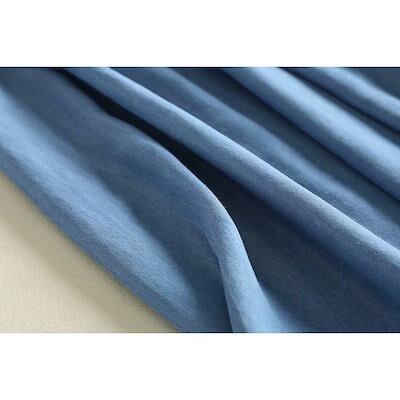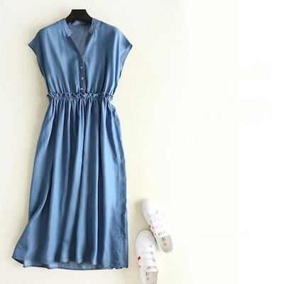 デニムワンピース ひざ丈ワンピース スタンド襟 切り替え フレンチスリーブ ウェストゴム ハイウェス