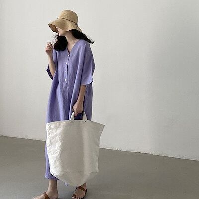 韓国/シンプル/綿麻/ワンピース/2024/夏/新作/ゆったり/半袖/ロング/綿シャツワンピース カップ 付きインナー